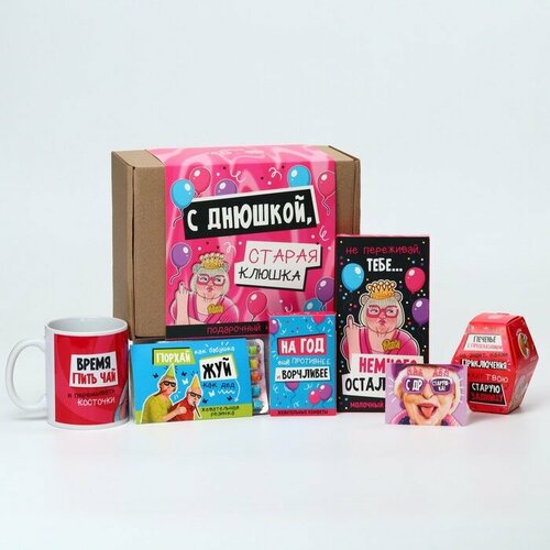 Гифтбокс «С днюшкой, старая клюшка»: кружка 300 мл, шоколад молочный 70 г, конфета жевательная 50 г, жвачка 11,5 г, печенье с предсказанием 1 шт, открытка, (18+)