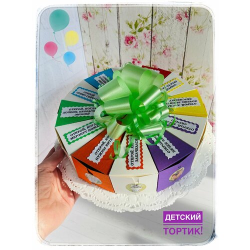 Во 2-м ярусе в каждом порционном кусочке "Открой просто так" спрятана небольшая вкусняшка! Ну, а как без нее! Конфетка + мотивирующая записка! Мелочь, а приятно!Каждый кусочек фиксируется наклейкой handmade и довольно легко открывается. И самое прикольное в таком тортике то, что в нем 0 калорий! А это мотивирующий бонус, правда!)А распаковывать кусочки напару с тем,