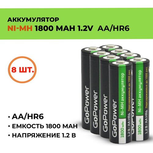 8шт. Аккумулятор GoPower 1800 мАч, АА/HR6, 1.2 В