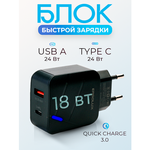 Блок питания, сетевое зарядное устройство 18W ERGOLUX USB 3 QC + Type C