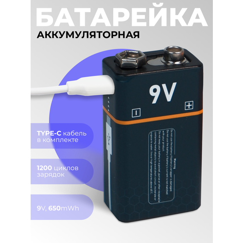 Аккумуляторная батарейка Крона 9V 650mAh USB Type-C черная перезаряжаемая для игрушек и устройств, Li-ion аккумулятор