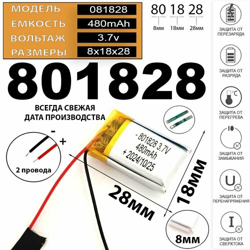 Аккумулятор 3.7v 801828 081828 Li-Pol батарея 480mAh универсальная аккумуляторная батарея 8x18x28 2 провода Терабайт Маркет