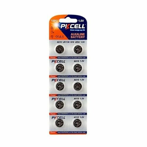 Щелочная батарейка AG10/LR1130/SR1130/LR54/189/389, 1.55V. 10 штук в блистере. PKCELL