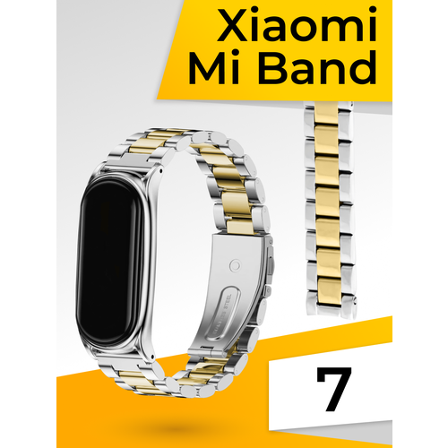 Металлический блочный браслет для Xiaomi Mi Band 7 / Стальной ремешок на Сяоми Ми Бэнд 7 / Серебро с золотом матовое