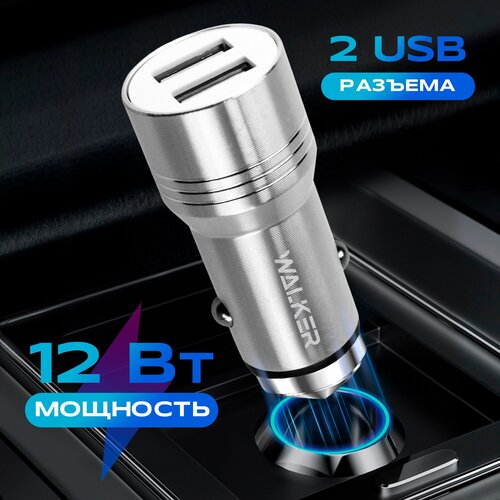 Автомобильная зарядка для телефона универсальная, 2 USB, 2.1А, WALKER, WCR-21, серебристая / зарядное устройство в прикуриватель, автозарядка в машину