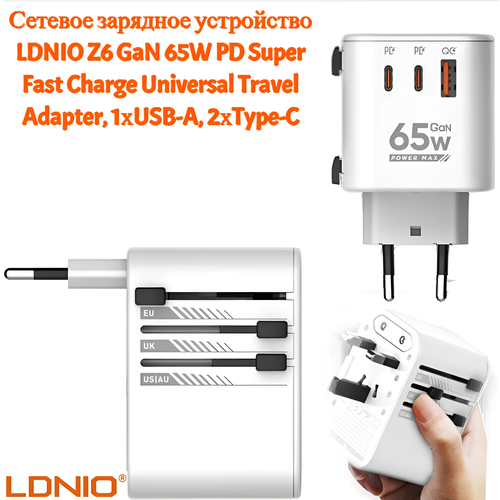Сетевое зарядное устройство LDNIO Z6 GaN 65W PD Super Fast Charge Universal Travel Adapter, 1хUSB-A, 2хType-C