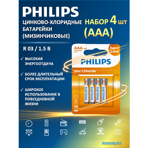 Батарейки мизинчиковые ААА Philips Greatlife R03G4B/97 (цинково-хлоридные), 4 шт. в блистере