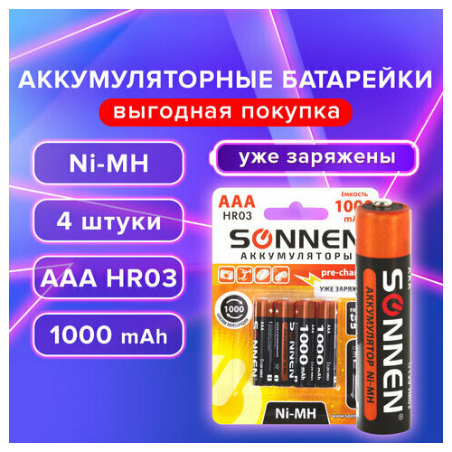 SONNEN Батарейки комплект 4 шт, Super Alkaline, AAA (LR03, 24А), алкалиновые, мизинчиковые, в блистере, 451096