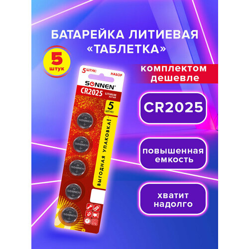 Батарейки таблетки дисковые литиевые набор 5 штук для часов, фонарика, лазерной указки, брелка сигнализации CR2025, блистер, Sonnen Lithium, 457140