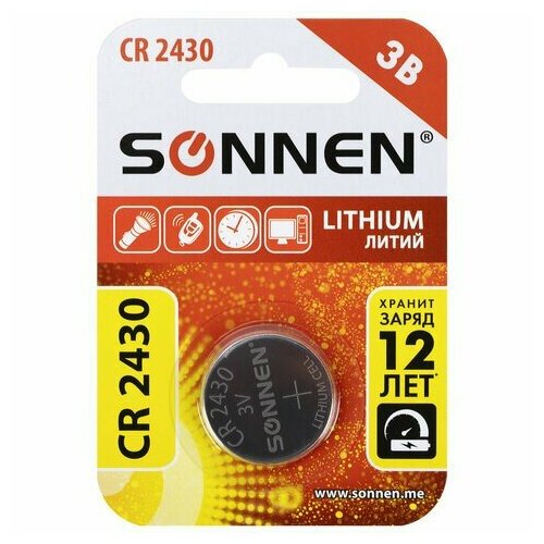 Батарейка литиевая SONNEN Lithium CR2430 "таблетка, дисковая, кнопочная" 1 шт, блистер, 455600