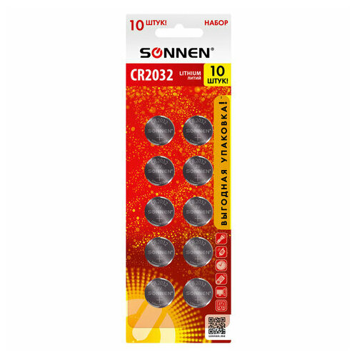 Батарейка литиевая CR2032 комплект 10 шт, "таблетка, дисковая, кнопочная" SONNEN Lithium, в блистере, 457143