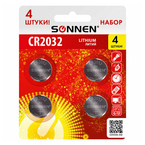 Батарейка литиевая CR2032 комплект 4 шт, "таблетка, дисковая, кнопочная" SONNEN Lithium, в блистере, 457142, 2 упаковки