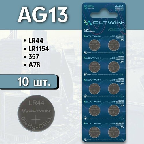 Батарейка часовая/ для часов и других приборов типа "таблетка" Woltwin AG13 (AG 13, LR44, A76) 10 шт. в блистере