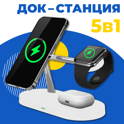 Док Станция 5 в 1 магнитный для телефона iPhone, Apple Watch, AirPods / Беспроводная зарядка 15W на Айфон, Андроид, Эпл Вотч, АирПодс / Белая