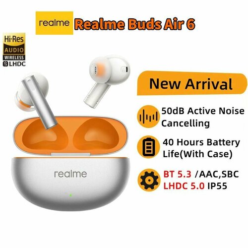 Наушники Realme Buds Air 6 TWS, беспроводные наушники с активным шумоподавлением 50 дБ, Bluetooth 5.3 LHDC 5.0, IP55, 40 часов автономной работы