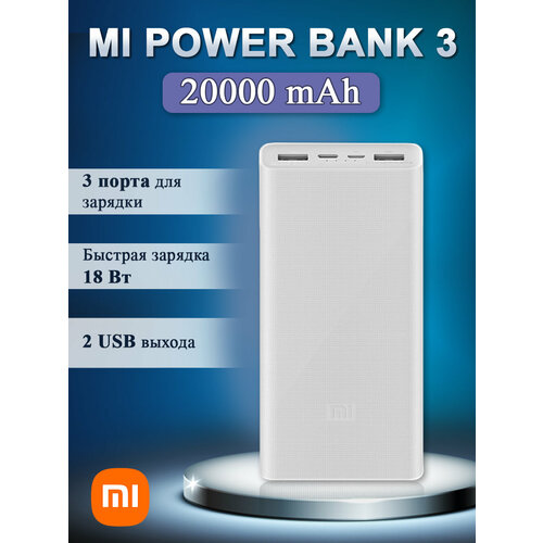 Портативный аккумулятор Xiaomi Mi Power Bank 3, 20000 mAh, белый, упаковка: коробка