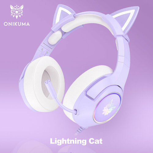 Игровые наушники ONIKUMA K9 Lightning Cat фиолетовые с кошачьими ушками и подсветкой