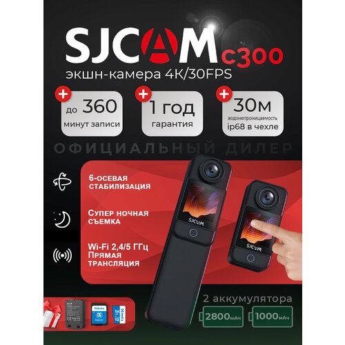 Экшн камера SJCam C300 черная с креплением, цифровым стабилизатором, водонепроницаемая 4K Ultra HD