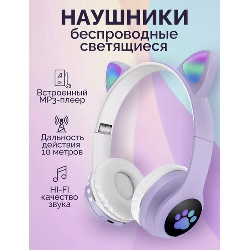 Детские беспроводные наушники с ушками кошки / Светящиеся беспроводные наушники для телефона Purple