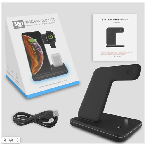 Беспроводное зарядное устройство 3 в 1 / зарядная док-станция для Apple iPhone, iWatch, AirPods, 15Вт, с поддержкой QI и быстрой зарядкой, черный