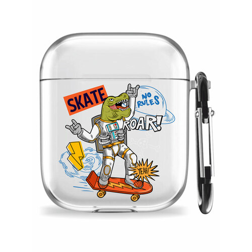 Силиконовый чехол Mcover для беспроводных наушников AirPods 1/2, с карабином, глянцевый, Динозавр на скейтборде V.2