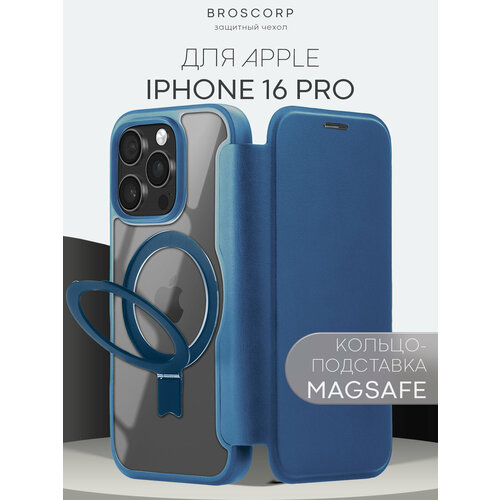 Чехол-книжка Broscorp на Apple iPhone 16 Pro (Айфон 16 Про), премиальный с магнитным кольцомсиний