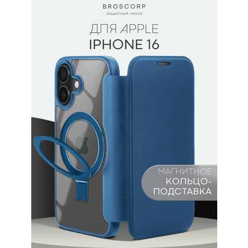 Чехол-книжка BROSCORP на Apple iPhone 16 (Айфон 16), премиальный с магнитным кольцом, синий