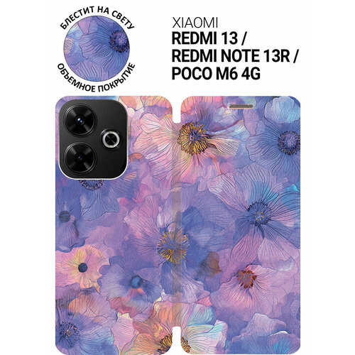 Чехол-книжка на Xiaomi Redmi 13 / Redmi Note 13R / Poco M6 4g с принтом "Фиолетовые маки" золотой