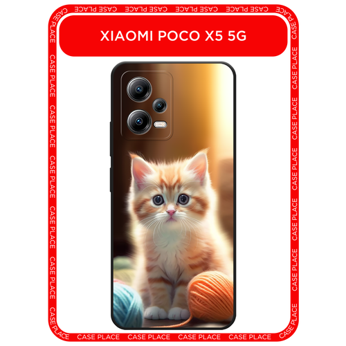 Черный матовый чехол на Xiaomi Poco X5 5G / Сяоми Поко X5 5G с принтом Рыжий котёнок с клубком