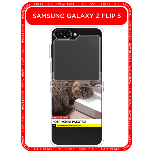 Чехол на Samsung Galaxy Z Flip 5 / Самсунг Z Flip 5 с принтом Кот уснул работая, прозрачный