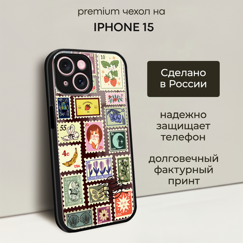 Чехол на Apple iPhone 15 / Айфон 15 с объемным принтом "Коллаж с марками"