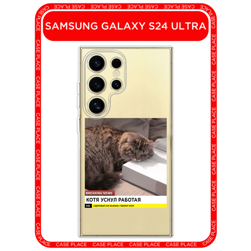 Чехол на Samsung Galaxy S24 Ultra / Самсунг S24 Ultra с принтом Кот уснул работая, прозрачный