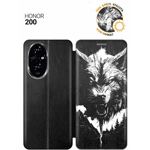Чехол-книжка на Honor 200 с принтом "Волк и горы" черный