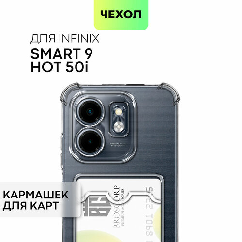 Противоударный чехол с кармашком на Infinix Smart 9 и Hot 50i (Инфиникс Смарт 9 и Хот 50и), бренд Broscorp, прозрачный