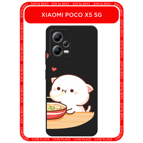 Черный матовый чехол на Xiaomi Poco X5 5G / Сяоми Поко X5 5G с принтом Белый котик с лапшой