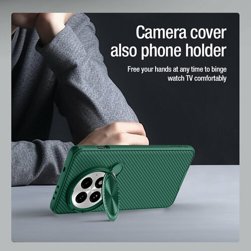 Чехол зеленого цвета (Dark Green) от Nillkin на OnePlus 13 с металлической откидной крышкой и поддержкой магнитной беспроводной зарядки MagSafe, серия CamShield Prop Magnetic Case