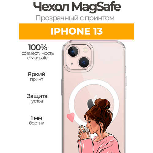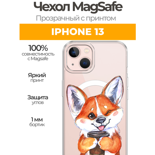 Чехол на Айфон 13 MagSafe с магнитом с принтом "Корги с кофе"