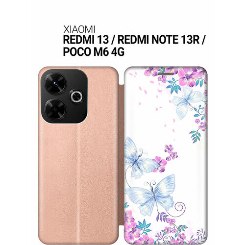 Чехол-книжка на Xiaomi Redmi 13 / Redmi Note 13R / Poco M6 4g с принтом "Бабочки и фиалки" золотой
