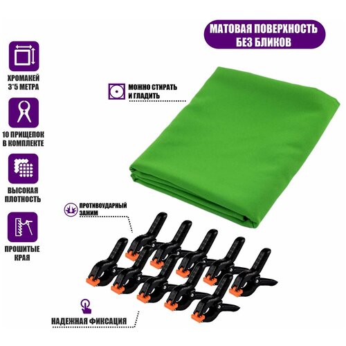 Фотофон тканевый хромакей для фотосессии, плотность 121.1 г/м2 , 3х5 м, с 10 прищепками