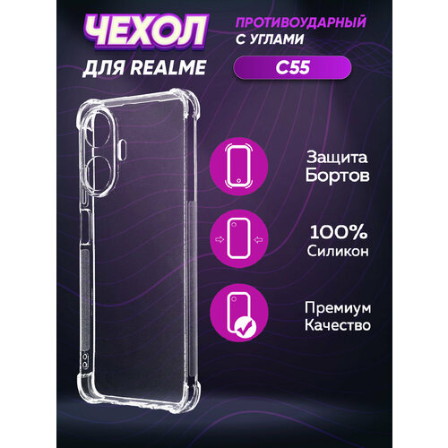 Силиконовый глянцевый транспарентный чехол с усиленными углами для Realme C55