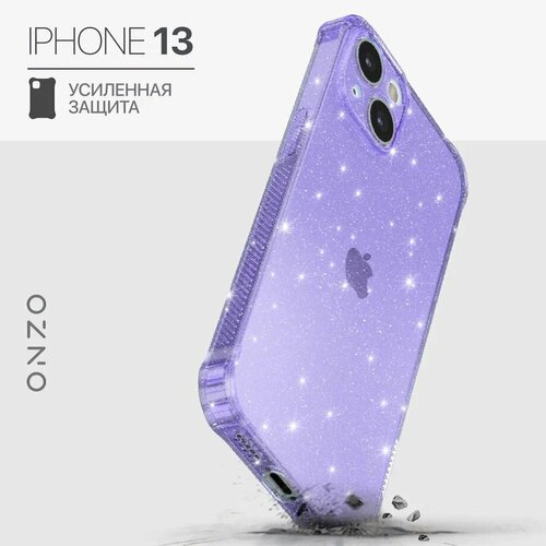 Чехол для iPhone 13 противоударный / Бампер накладка на Айфон 13 фиолетовый прозрачный с блестками