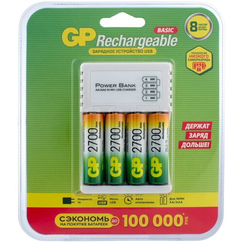 Зарядное устройство GP для аккумуляторных батареек АА, ААА, аааа, А, SC, C на 4 слота, с аккумуляторами AA 2700 mAh, набор 4 шт, с кабелем micro USB