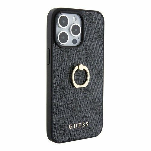 Guess для iPhone 15 Pro Max чехол из кожи PU с узором 4G + кольцо-держатель, серый