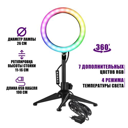 Лампа кольцевая настольная RGB-TR26A, диаметр 26 см, с эффектом RGB на шарнире c адаптером питания