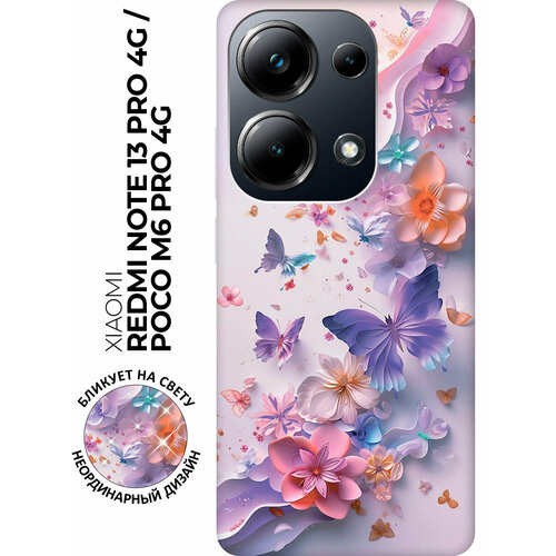 Силиконовый чехол на Xiaomi Redmi Note 13 Pro 4G / Poco M6 Pro 4G с принтом "Фиолетовые бабочки и бумажные цветы"