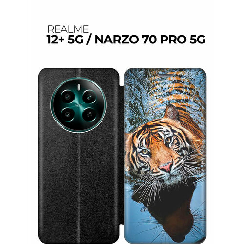 Чехол-книжка на Realme 12+ 5g / Narzo 70 Pro 5g с принтом "Тигр купается" черный