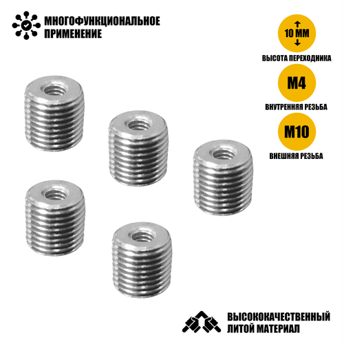 Резьбовая гайка переходник с внешней резьбой М10 и внутренней резьбой М4, высота 10 мм, 5 шт