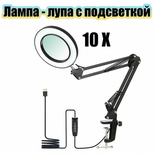 Лампа настольная с лупой 10X, на гибком кронштейне 25x25 см, на струбцине, линза 105 мм, подсветка - регулировка яркости и цвета