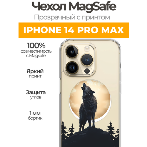Чехол на Айфон 14 Про Макс (Apple iPhone 14 Pro Max) MagSafe с магнитом и принтом "Волк воет на луну"