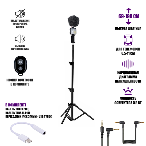 Микрофон пушка BY-MM1 с ветрозащитой и переходником Jack 3.5 мм - USB Type-C на напольном штативе с осветителем держателем телефона и кнопкой Bluetooth
